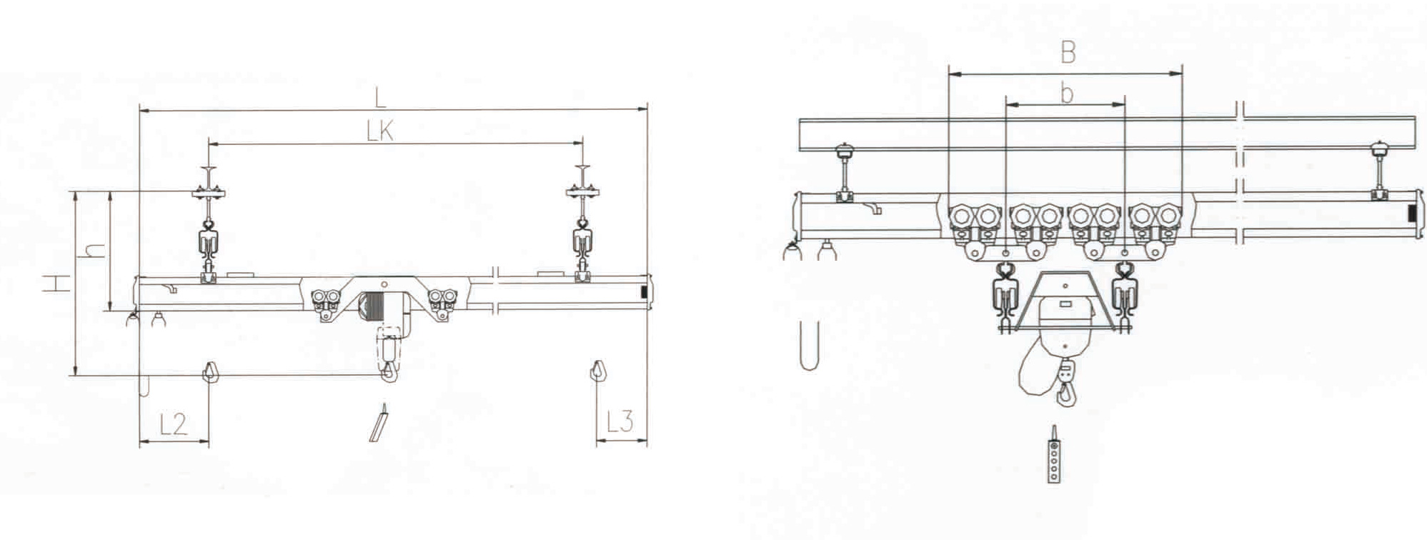 雙梁與JPK型環(huán)鏈電動(dòng)葫蘆配套使用,電動(dòng)葫蘆運(yùn)行小車可以沿主梁方向運(yùn)行。